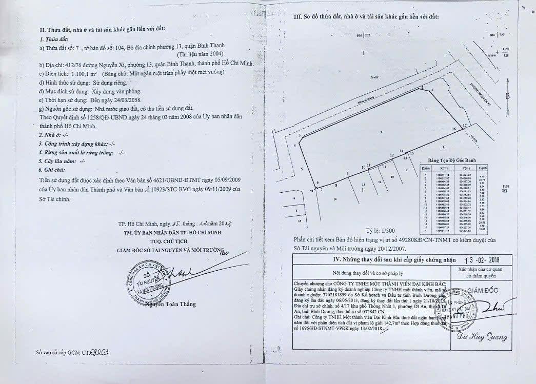 - Diện tích đất CN: 1100m2 ( Ngang 19m × Dài 61m ) - trong đó: 1089,7m2 thổ cư