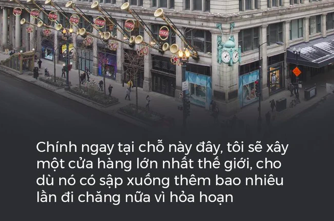 Người thương gia đó chỉ tay vào đống tro tàn trước kia từng là cửa hàng của mình và tuyên bố: "Các ngài hãy chờ xem, chính ngay tại chỗ này đây, tôi sẽ xây nên một cửa hàng lớn nhất thế giới, cho dù nó có sập xuống thêm bao nhiêu lần đi chăng nữa vì hỏa hoạn".
