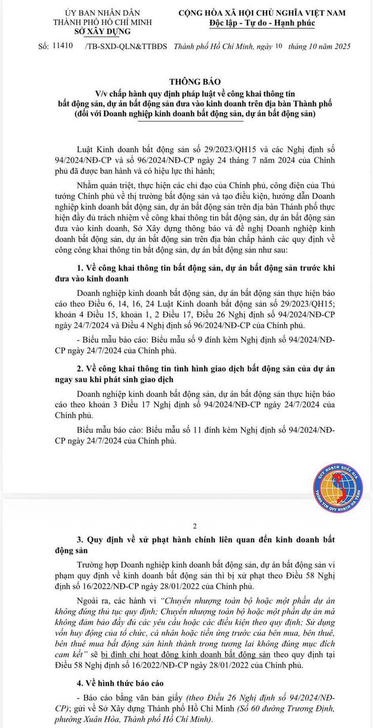Các doanh nghiệp kinh doanh bất động sản, dự án bất động sản phải báo cáo bằng văn bản giấy theo quy định gửi về Sở Xây dựng TP.HCM (số 60 Trương Định, phường Xuân Hòa, TP.HCM).