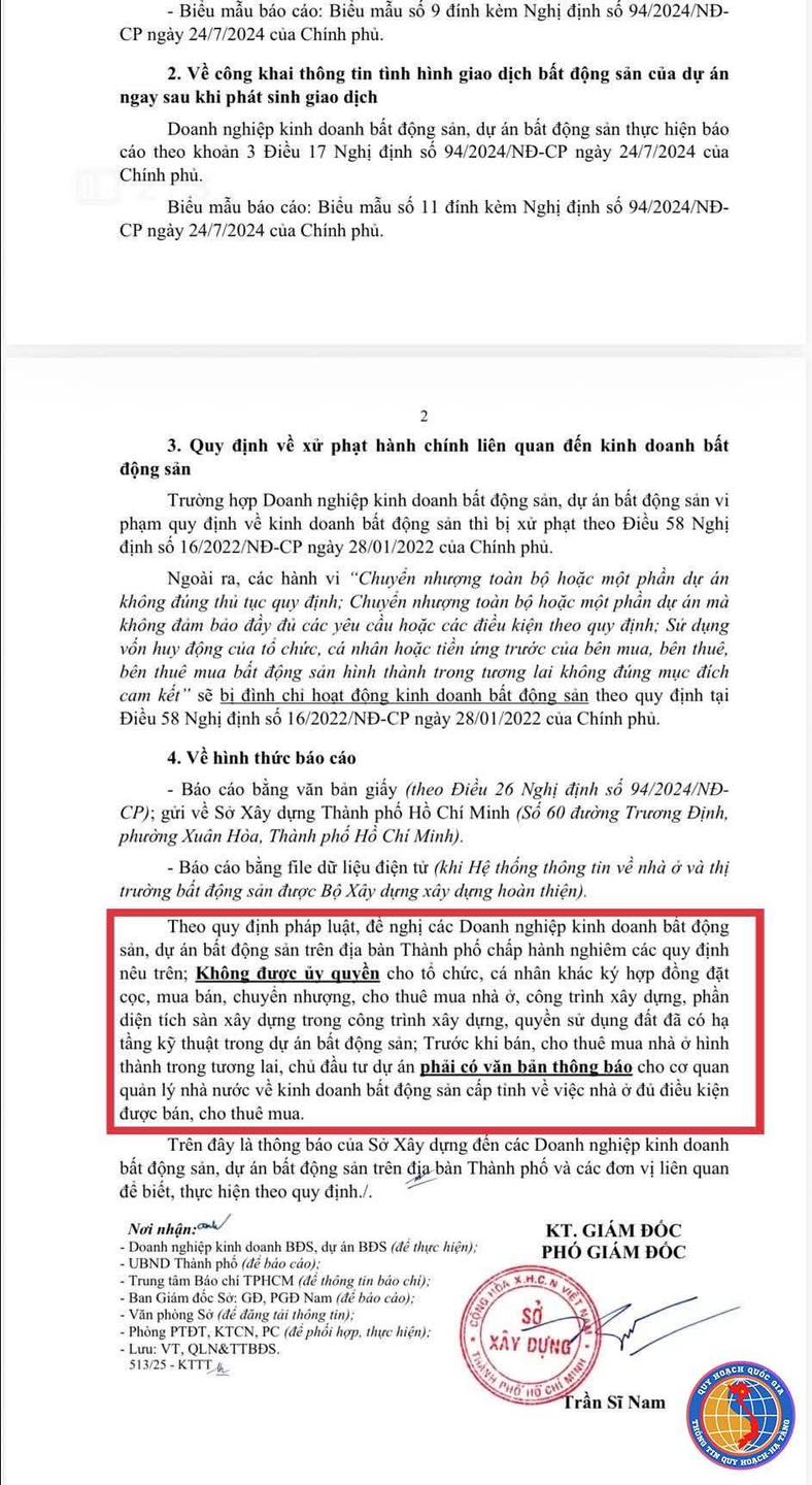 Doanh nghiệp bất động sản trên địa bàn TP.HCM phải chấp hành nghiêm quy định công khai thông tin dự án bất động sản, không được ủy quyền cho tổ chức, cá nhân khác ký hợp đồng đặt cọc, mua bán.