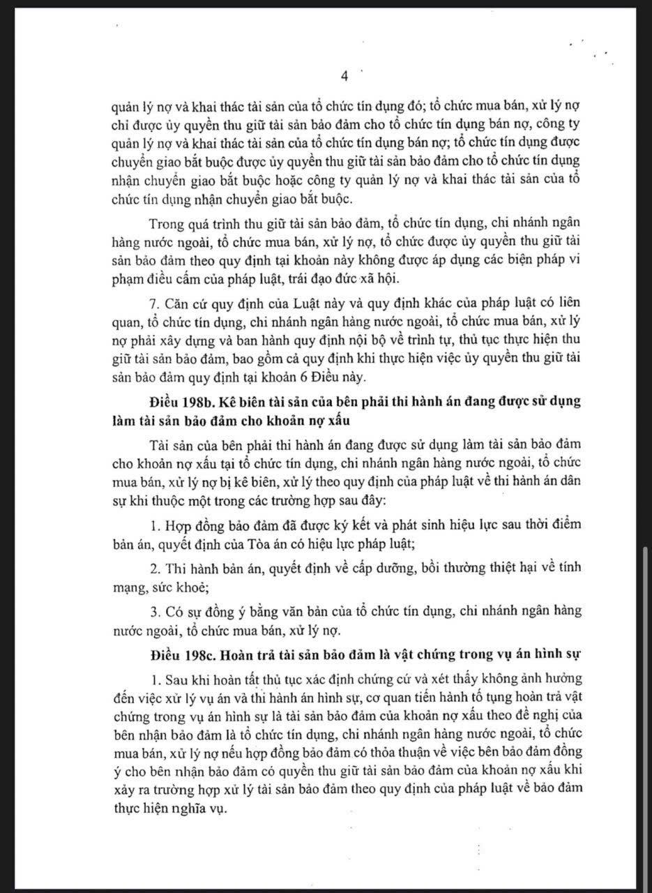 - Ngân hàng được quyền thu giữ tài sản bảo đảm để xử lý nợ xấu, mà không cần mất 2–3 năm qua các vòng khởi kiện, thi hành án như trước nữa.
